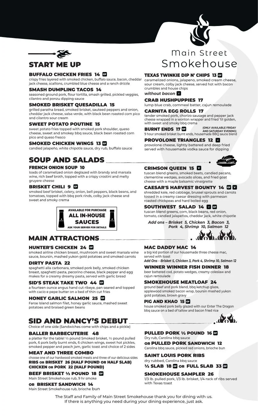 Indulge in a culinary journey at Main Street Smokehouse, where every dish tells a story. Our menu is a fusion of traditional flavors and modern twists, crafted with passion and expertise. From sizzling steaks to mouthwatering BBQ, each bite is a celebration of taste and quality. Whether you crave hearty comfort food or gourmet delicacies, our chefs are dedicated to delivering a memorable dining experience. Join us and savor the essence of exceptional cuisine in a warm and inviting atmosphere.